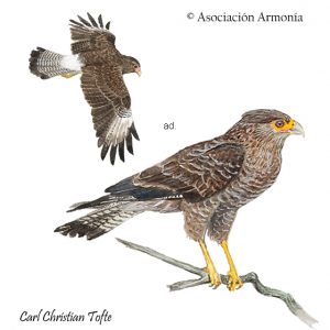 Easily overlooked and mistaken for juvenile/immature Yellow-headed Caracara, which has gray legs, densely streaked or blotched (not faintly barred) underparts with paler buff background color.Fácilmente pasado por alto y confundido con el Caracara Chimachima juvenil/inmaduro, que tiene patas grises, partes ventrales beige y densamente estriados o manchados (no finamente barrados).
