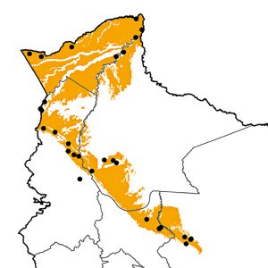 Rare and local in Amazonian terra firme, transitional, várzea, and humid Andean foothill forest.Raro y local en bosque amazónico de tierra firme, várzea y transicional y en bosque húmedo del piedemonte andino.